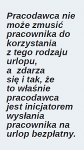 W odwrotnej sytuacji pracodawca nie może zmusić pracownika do korzystania z tego rodzaju urlopu, a zdarza się i tak, że to właśnie pracodawca jest inicjatorem wysłania pracownika na urlop bezpłatny. Udzielenie pracownikowi urlopu bezpłatnego z inicjatywy pracodawcy (bez pisemnego wniosku pracownika) jest nieprawidłowe. Potwierdził to Sąd Apelacyjny w Łodzi w wyroku z 15 października 1996 r. (III AUa 34/96, OSA 1997/10/35), wskazując jednoznacznie, że udzielenie pracownikowi urlopu bezpłatnego – niezgodnie z przepisem art. 174 § 1 k.p. – z inicjatywy zakładu pracy i bez pisemnego wniosku o udzielenie mu takiego wolnego – jest w świetle prawa bezskuteczne. Takie jednostronne udzielenie urlopu bezpłatnego np. na czas przestoju należy kwalifikować jako naruszenie kodeksowych przepisów o urlopach pracowniczych.
