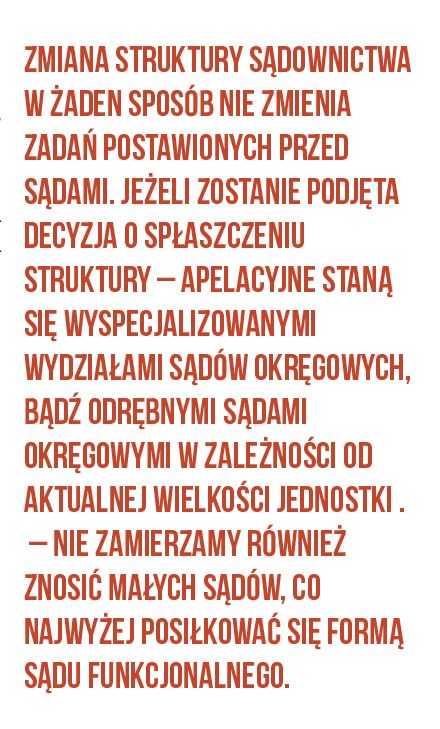Tego etapu reformy bardziej niż pracownicy mogą obawiać się sędziowie, ponieważ w planach jest stworzenie zasady, że sędzia przypisany zostanie do danego okręgu i w jego obrębie będzie mógł być skierowany do orzekania w każdym sądzie w zależności od potrzeb. Jeśli chodzi o etaty urzędnicze, to już powoli przygotowywany jest ten etap poprzez zabieranie części wygasłych etatów z poszczególnych sądów, żeby łatwiej było później na nowo je rozdysponować w nowej strukturze. Ma to zapobiec sytuacji, w której konieczne byłoby fizyczne przeniesienie pracownika do pracy w jednostce znacznie oddalonej od miejsca zamieszkania. – Zmiana struktury sądownictwa w żaden sposób nie zmienia zadań postawionych przed sądami – jeżeli dojdzie do spłaszczenia struktury sądów to dotychczasowe sądy apelacyjne przekształcą się w wyspecjalizowane wydziały sądów okręgowych, bądź staną się odrębnymi sądami okręgowymi w zależności od aktualnej wielkości jednostki – tłumaczył Łukasz Piebiak. – Nie zamierzamy również znosić małych sądów, co najwyżej w niektórych wypadkach posiłkować się formą sądu funkcjonalnego. Z wypowiedzi wynikało, że prace związane ze zmianą struktury sądownictwa planowane są raczej na rok 2018. Być może jakieś działania zostaną podjęte już jesienią bieżącego roku.