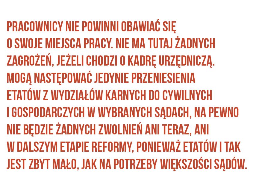 Ponadto w najbliższych miesiącach dojdzie także do łączenia małych jednorodzajowych wydziałów – zwłaszcza w pionie karnym. Będzie to prowadziło do zmniejszenia ilości stanowisk funkcyjnych przewodniczących wydziałów, może także w efekcie spowodować likwidację stanowisk kierowników sekretariatów. Pracownicy nie powinni jednak obawiać się o swoje miejsca pracy. Nie ma tutaj żadnych zagrożeń, jeżeli chodzi o kadrę urzędniczą, mogą następować jedynie przeniesienia etatów z wydziałów karnych do cywilnych i gospodarczych w wybranych sądach, na pewno nie będzie żadnych zwolnień ani teraz, ani w dalszym etapie reformy, ponieważ etatów i tak jest zbyt mało, jak na potrzeby większości sądów.