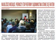 Reforma sądownictwa staje się faktem. – To dopiero początek – zapowiada wiceminister Łukasz Piebiak. Zmiany dotyczące dyrektorów, prezesów i wiceprezesów sądów mają na celu definitywne oddzielenie administracji sądowej od pionu orzeczniczego. – Kończy się również władza dyrektorów i prezesów apelacyjnych. Dyrektorzy będą bezpośrednio ponosić odpowiedzialność przed ministerstwem, więc spodziewana jest większa chęć do prowadzenia dialogu przez dyrektorów także ze stroną społeczną. Pierwszy etap ma zakończyć się przed rozpoczęciem wakacji sejmowych. Kolejny etap to zmiana struktury sądownictwa polegająca na zniesieniu sądów apelacyjnych oraz zwiększeniu ilości okręgów sądowych. Ministerstwo nie ma zamiaru znosić małych sądów. Będą podejmowane działania mające na celu uatrakcyjnienie zawodu asystenta sędziego. Asystenci i referendarze mają stać się docelową służbą w obrębie sądownictwa, a nie przystankiem w karierze prawniczej. Nic nie grozi pracownikom sądów, nie będzie żadnych grupowych ani indywidualnych zwolnień – uspokaja ministerstwo.